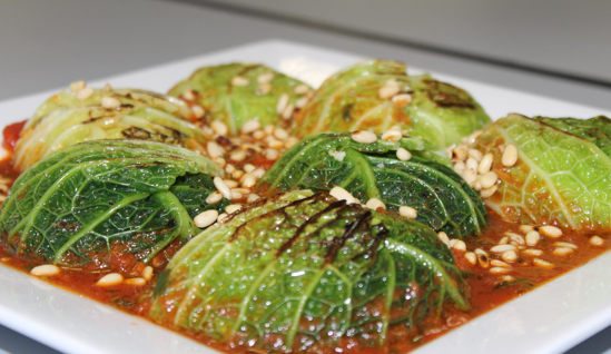 Каждый лист савойской капусты помещаем в формочку или чашку, наполняем начинкой, накрываем свободными краями и хорошо придавливаем. Переворачиваем и вынимаем чемоданчик. На раскаленной сковороде их немного поджариваем с обеих сторон. Далее добавляем соус и можно поместить в разогретую до 200С духовку еще на 10-15 минут. Перед подачей посыпать кедровыми орешками.